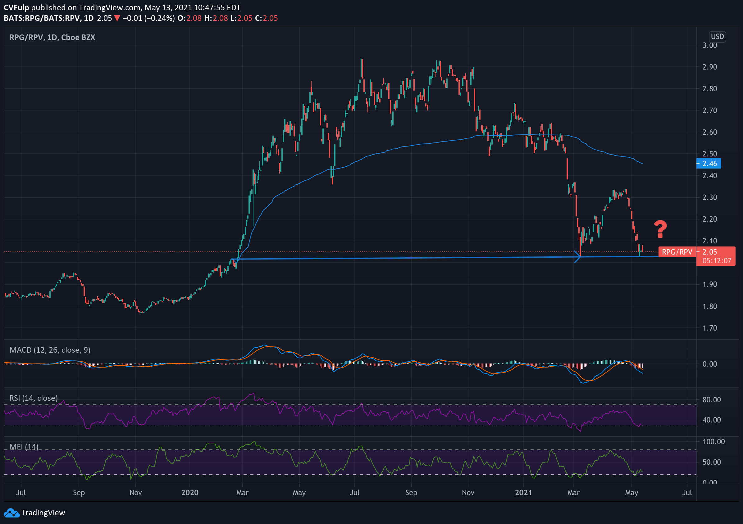Additionally, I thought the following to be a very interesting development in the conversation of Growth vs. Value. The following is a chart of RPG/RPV. Note the significance of the blue horizontal line beginning just before the surge up in growth resulting from the government imposed shutdowns (3/20). The volume weighted average price suggests this $2.02 level could be/should be violated, but it makes a case for one last push from growth before the ultimate value shift becomes fully underway. Will wait to see.